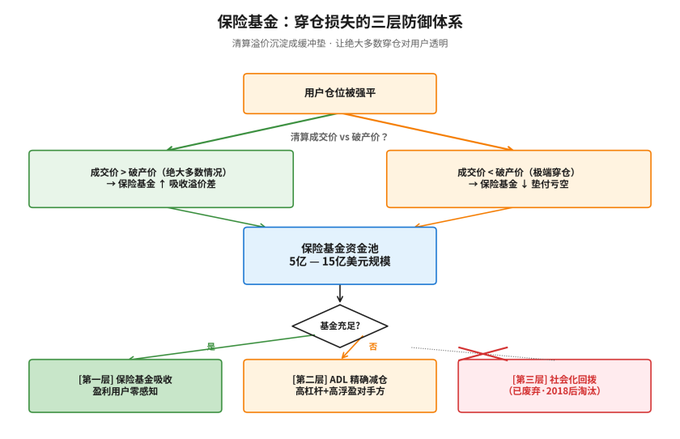 第二,建立规模足够大的风险准备金池(Insurance Fund)来吸收穿仓亏损,而不是摊派给用户。