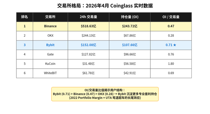 当时正值LUNA崩盘后的深度熊市,机构做市商和量化基金对资本效率的敏感度前所未有地高——一个能把期现套利保证金需求压缩接近零的交易所,就是能比竞争对手多跑几倍策略规模的交易所。Bybit用PM+UTA这套组合拳,在短短一年内从OKX之后的”第二梯队”中拔地而起,吸收了大量原本属于其他平台的机构做市流动性。今天看Coinglass的数据,Bybit的OI/交易量比值(0.71)明显高于Binance(0.47)和OKX(0.28),这个结构性的差异正是当年PM先发优势的延长线——Bybit沉淀了更多的专业套利持仓,而不是单纯的散户换手。
